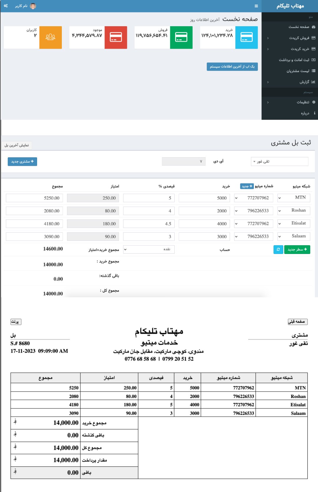 Mahtab Telecom is a wholesale management system designed to handle stock, sales, profits, and expenses. It also generates various financial reports and automatically creates customer invoices.